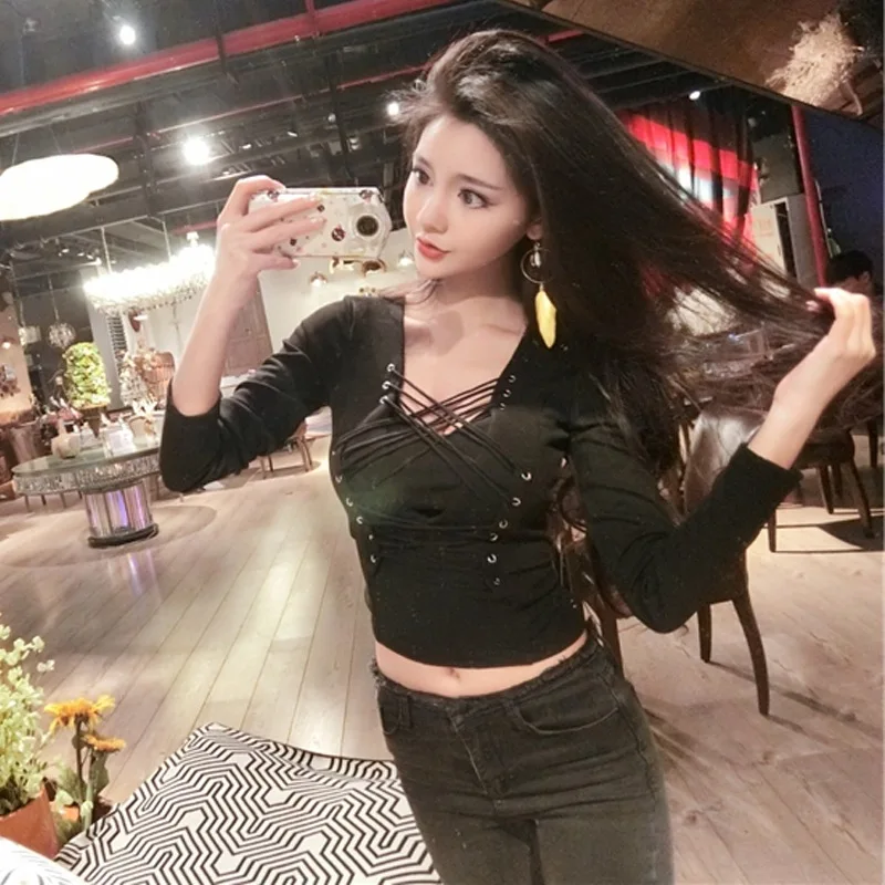 Photo Shoot ~ Autumn Online Celebrity Sexy Nightclub Cool Lace-up Tying Base Shirt Slim Fit Long-sl